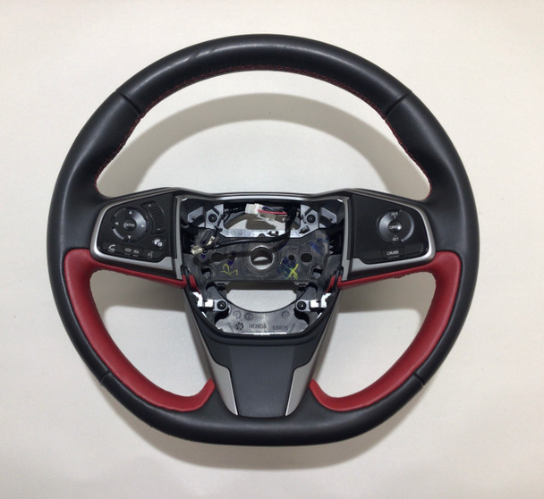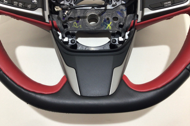 2017-2019 Honda Civic Type R OEM Black / Red Leather Steering Wheel w/ Trim. Removed from a 2018 Honda Civic Type R with 13k original miles. In good physical condition, has not been hit or bent in any way. The leather rim does have some heavier scratches and nicks along the outer rim as shown. Stitching is fully intact with no fraying. Radio and cruise controls are in good working condition, fully tested prior to removal from the vehicle. You will need to reuse your existing hardware and driver air bag for installation.