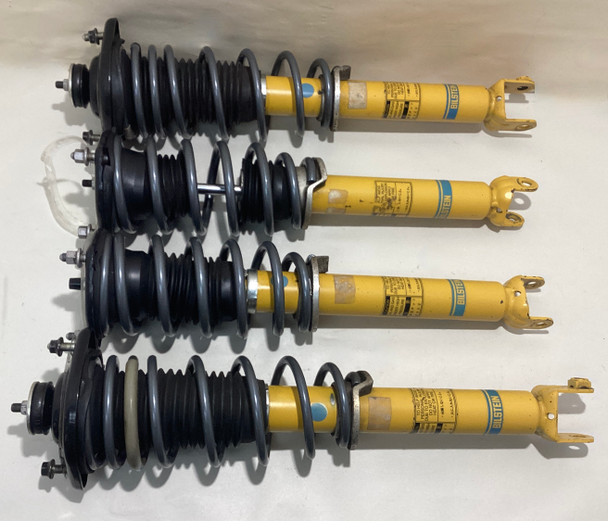 Includes the set of 4 factory Bilstein shocks with aftermarket Progress Technology lowering springs, as shown. In mostly good used physical condition, with no major hits or damage, however, the dust covers are cracked and torn from age and regular use, as shown in the photos. Free of any major surface rusting or corrosion. You will need to reuse your existing hardware for installation.